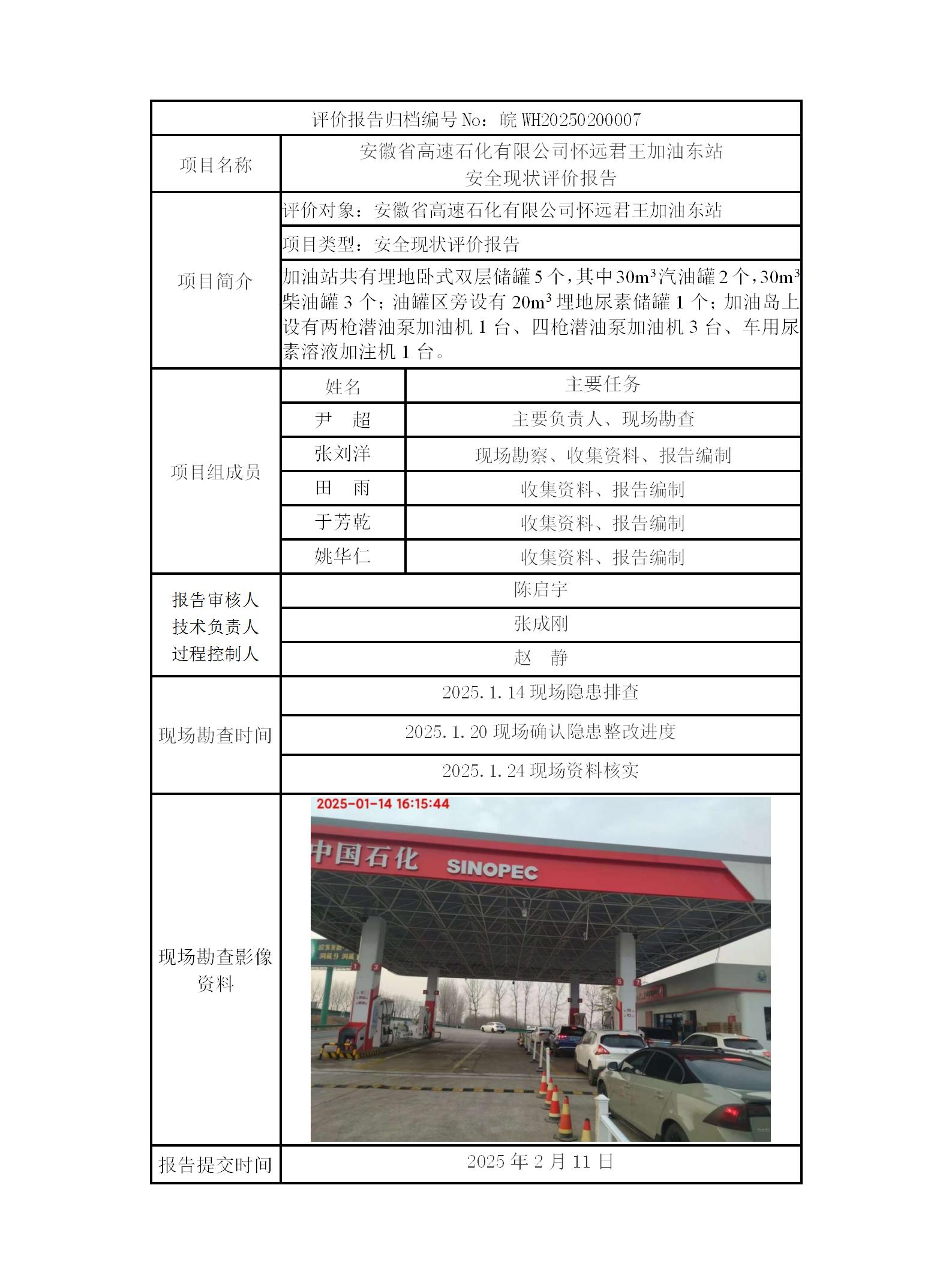 安徽省高速石化有限公司懷遠(yuǎn)君王加油東站 安全現(xiàn)狀評價報告