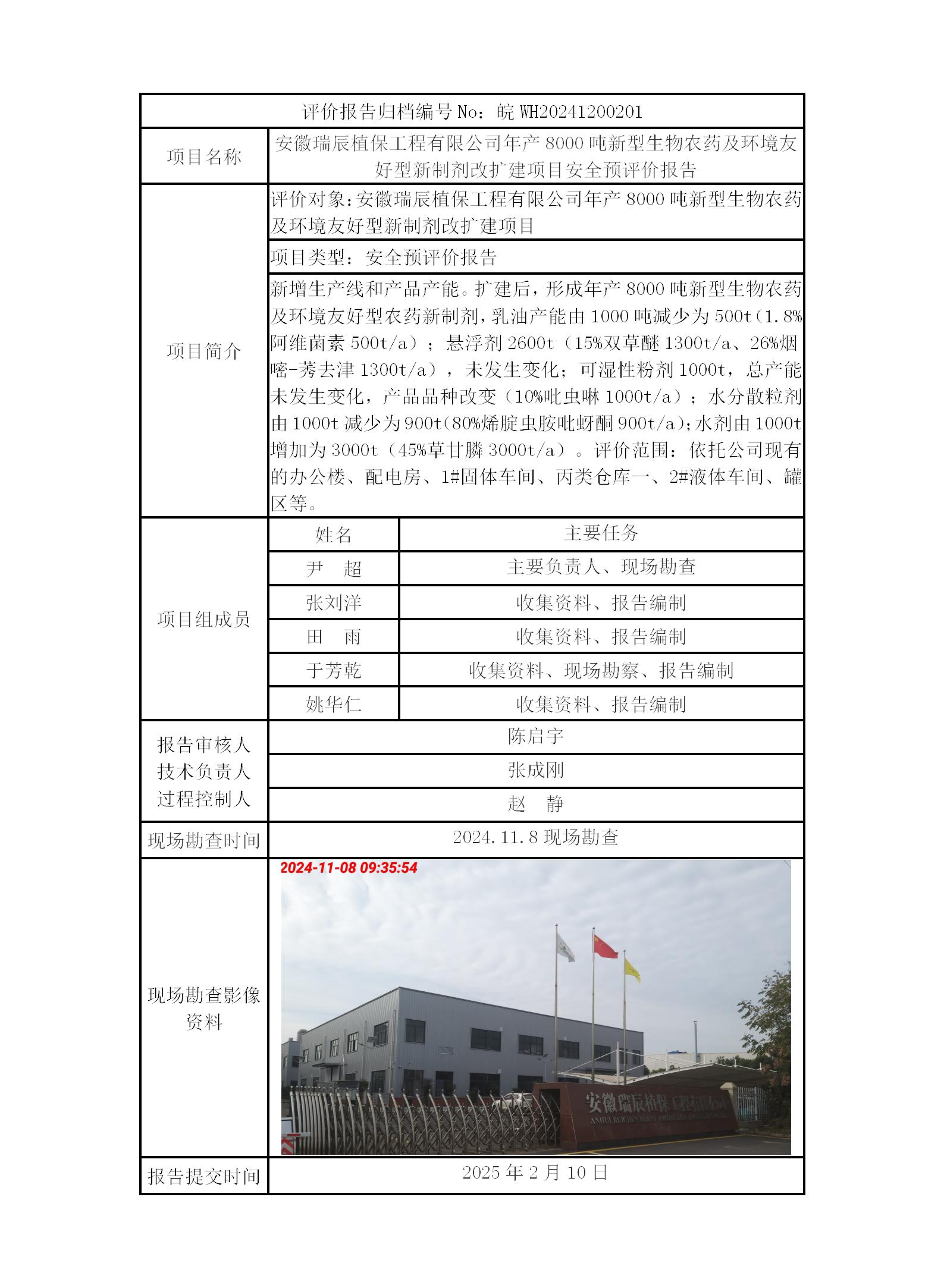 安徽瑞辰植保工程有限公司年產8000噸新型生物農藥及環境友好型新制劑改擴建項目安全預評價報告