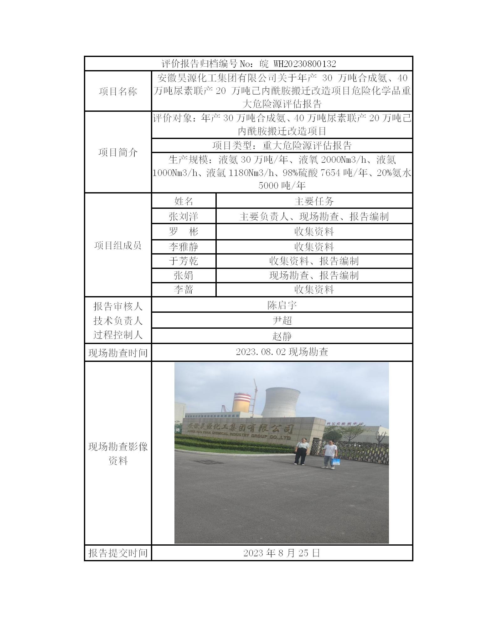 安徽昊源化工集團有限公司關于年產 30 萬噸合成氨、40 萬噸尿素聯產20 萬噸己內酰胺搬遷改造項目危險化學品重大危險源評估報告