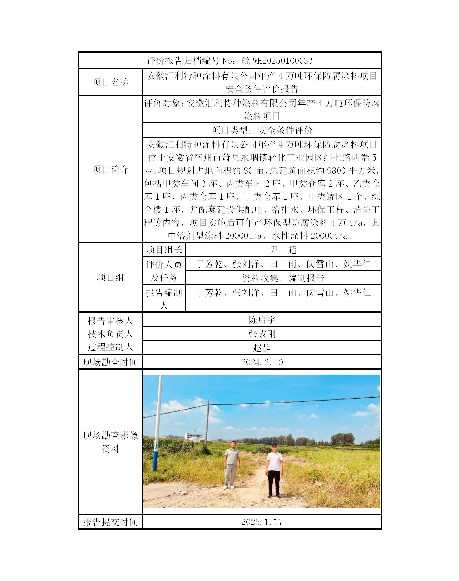 安徽匯利特種涂料有限公司年產4萬噸環保防腐涂料項目安全條件評價報告