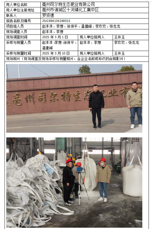 亳州司爾特生態肥業有限公司2025年職業病危害因素定期檢測報告