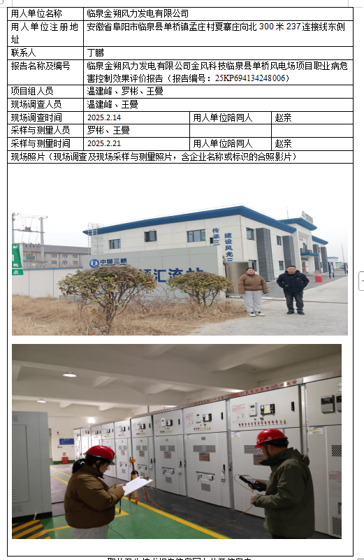 臨泉金朔風力發電有限公司金風科技臨泉縣單橋風電場項目職業病危害控制效果評價報告