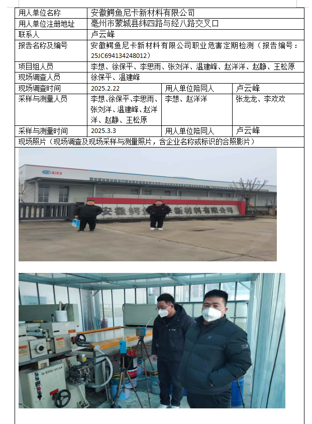 安徽鱷魚尼卡新材料有限公司職業(yè)危害定期檢測