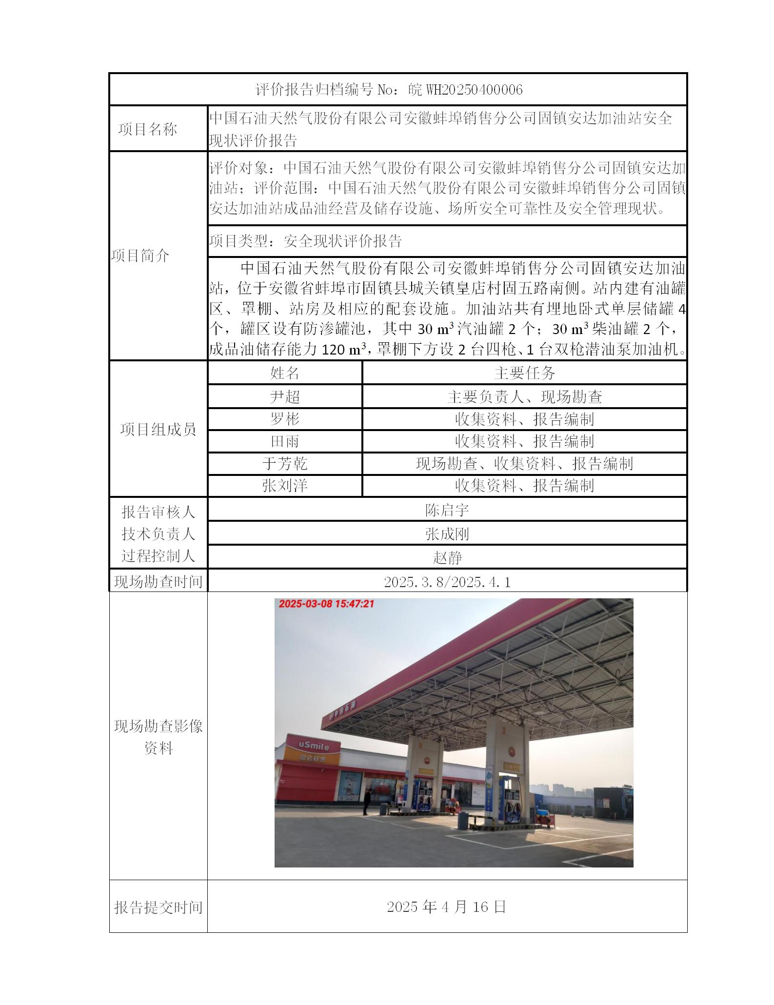 中國石油天然氣股份有限公司安徽蚌埠銷售分公司固鎮(zhèn)安達(dá)加油站安全現(xiàn)狀評(píng)價(jià)報(bào)告