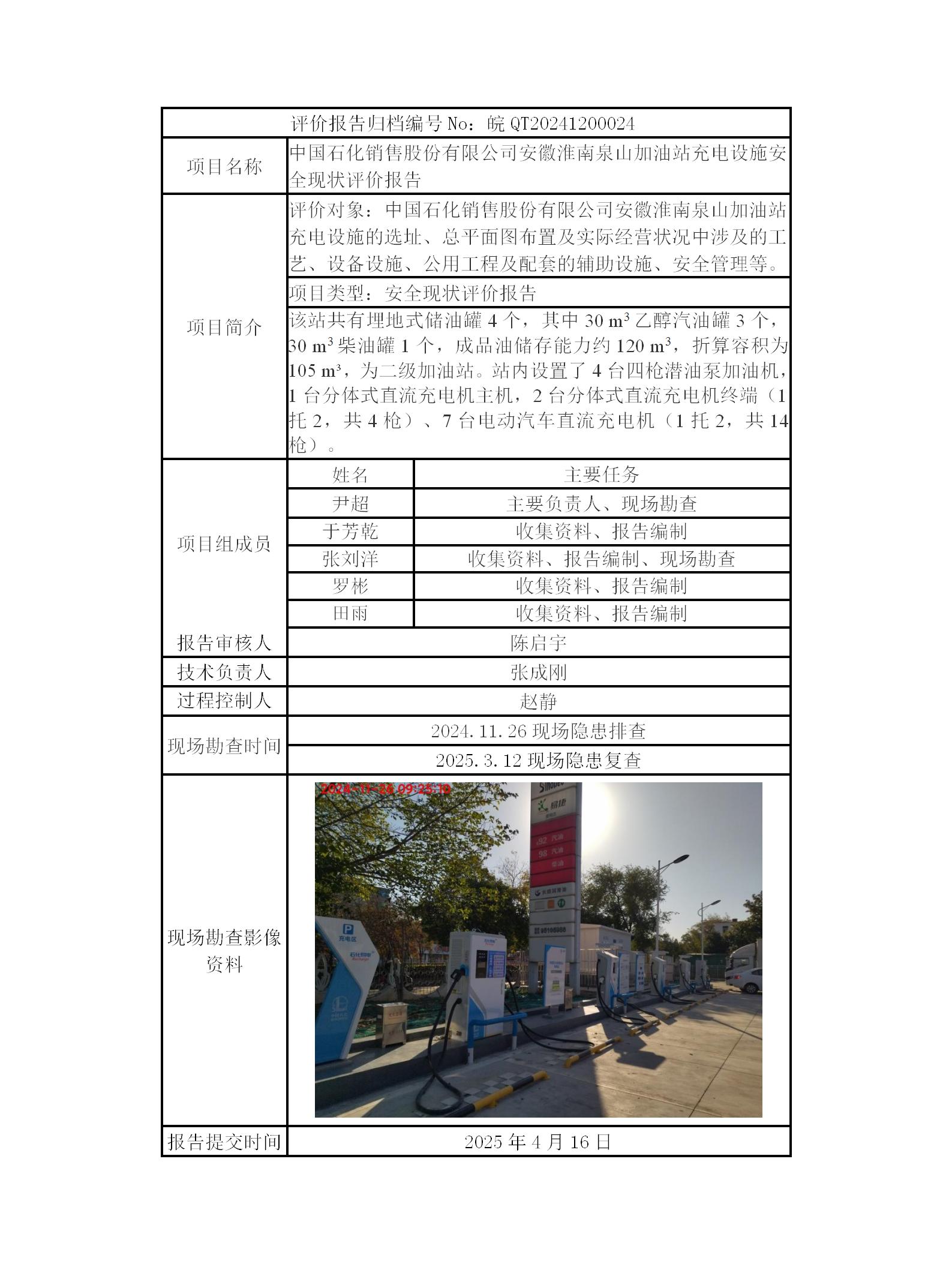 中國石化銷售股份有限公司安徽淮南泉山加油站充電設施安全現狀評價報告