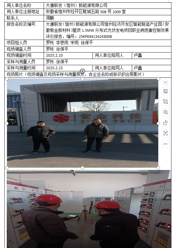 大唐聯發(宿州)新能源有限公司宿州經濟開發區智能制造產業園(安徽紫金新材料)屋頂1.5MW分布式光伏發電項目職業病危害控制效果評價報告
