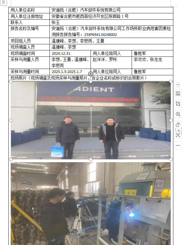 安道拓(合肥)汽車部件系統(tǒng)有限公司工作場(chǎng)所職業(yè)病危害因素檢測(cè)報(bào)告