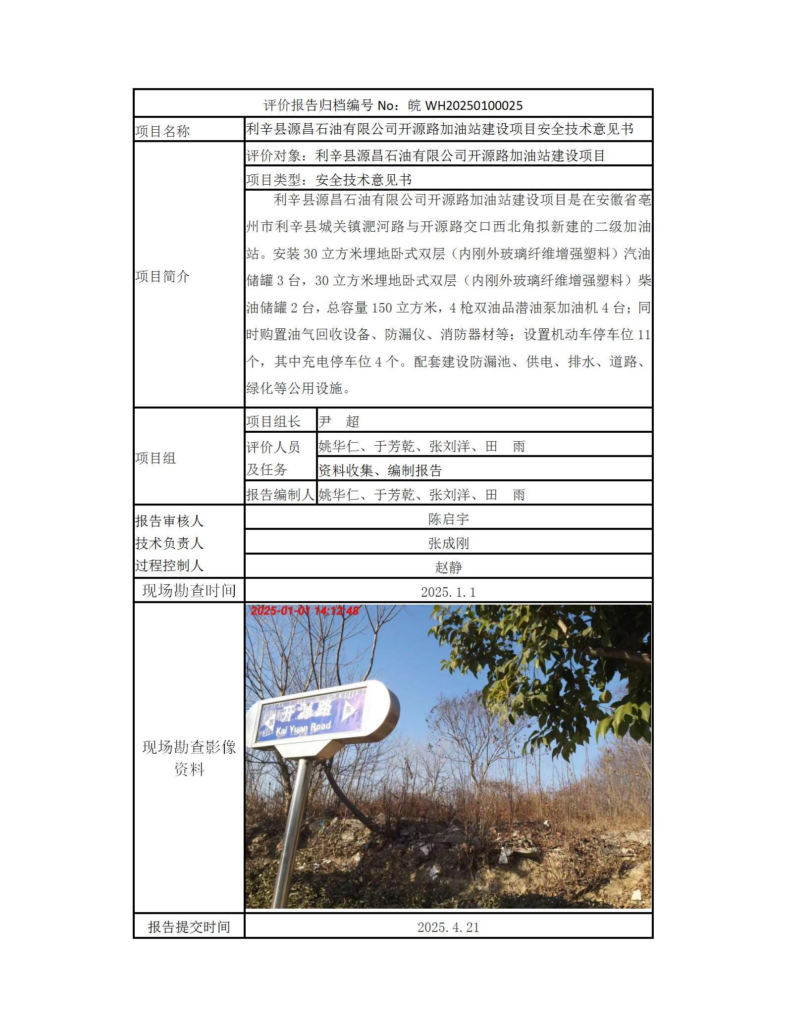 利辛縣源昌石油有限公司開源路加油站建設項目安全技術意見書