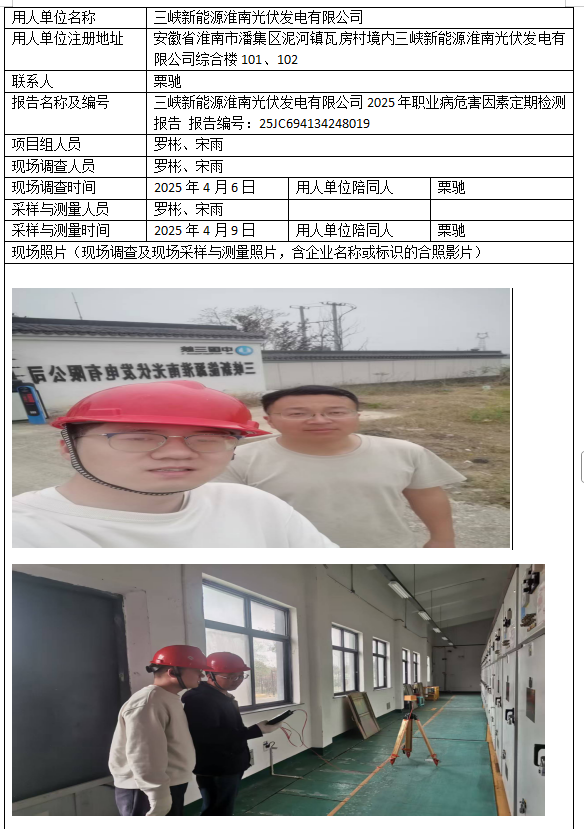 三峽新能源淮南光伏發電有限公司2025年職業病危害因素定期檢測報告