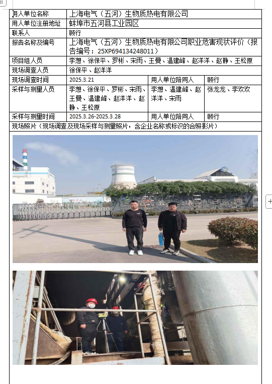 上海電氣(五河)生物質熱電有限公司職業危害現狀評價