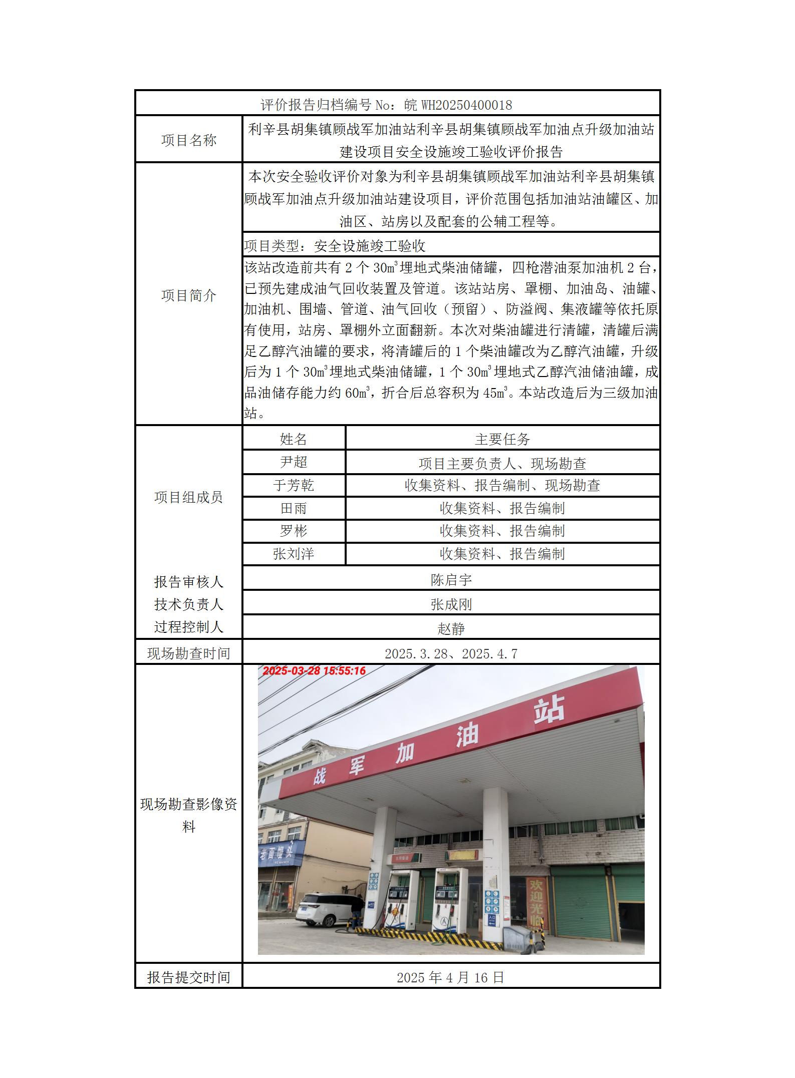 利辛縣胡集鎮顧戰軍加油站利辛縣胡集鎮顧戰軍加油點升級加油站建設項目安全設施竣工驗收評價報告