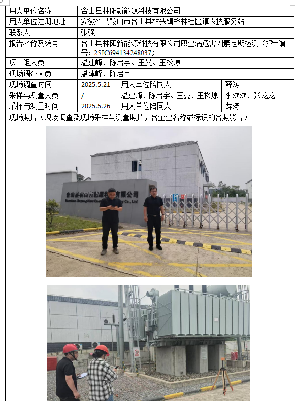 含山縣林陽(yáng)新能源科技有限公司職業(yè)病危害因素定期檢測(cè)