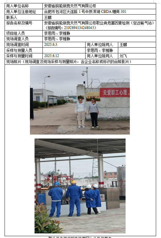 安徽省皖能新奧天然氣有限公司職業(yè)病危害因素檢測(cè)(定遠(yuǎn)輸氣站)