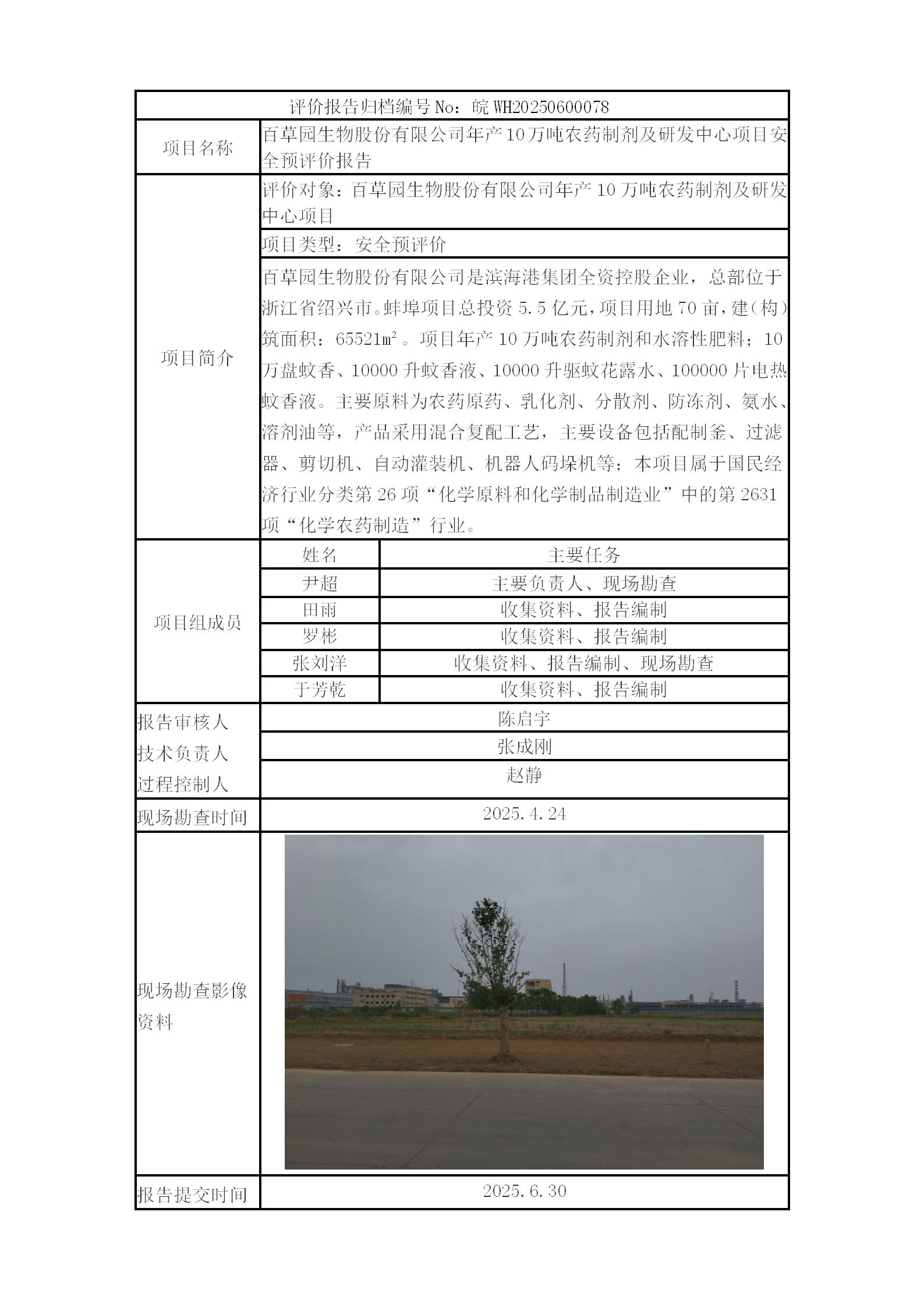 百草園生物股份有限公司年產10萬噸農藥制劑及研發(fā)中心項目安全預評價報告