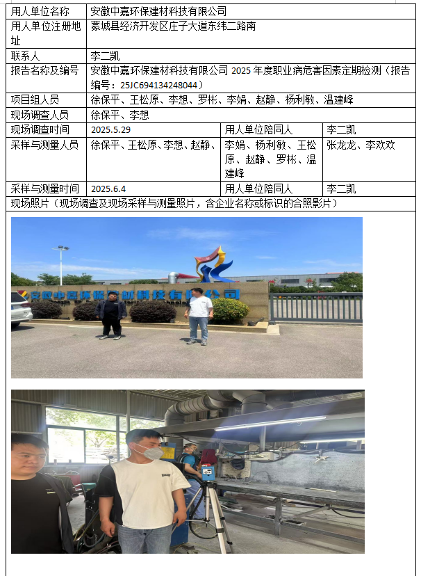 安徽中嘉環保建材科技有限公司2025年度職業病危害因素定期檢測