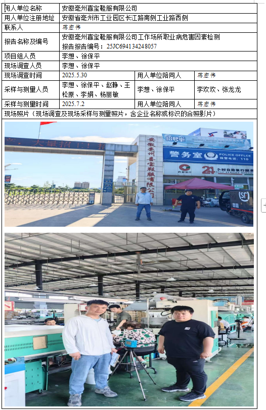 安徽亳州喜寶鞋服有限公司工作場所職業病危害因素檢測