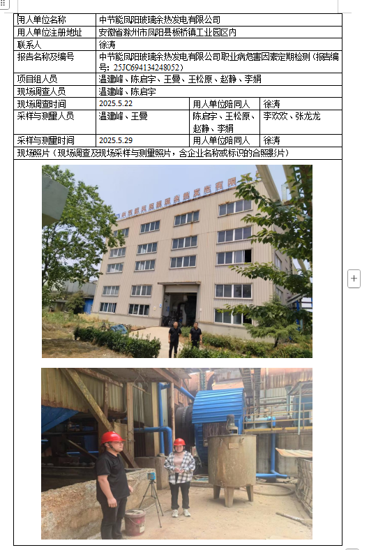 中節能鳳陽玻璃余熱發電有限公司職業病危害因素定期檢測