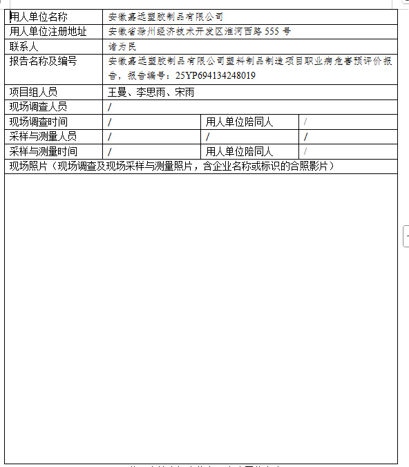 安徽嘉遠塑膠制品有限公司塑料制品制造項目職業病危害預評價報告